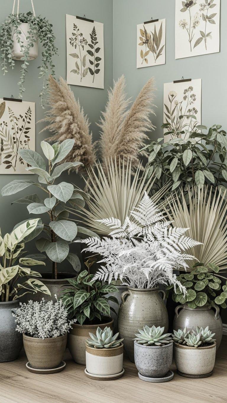 Layer muted greens—sage, olive-gray, and dusty pistachio—to create a modern neutral backdrop that reads calm and considered.