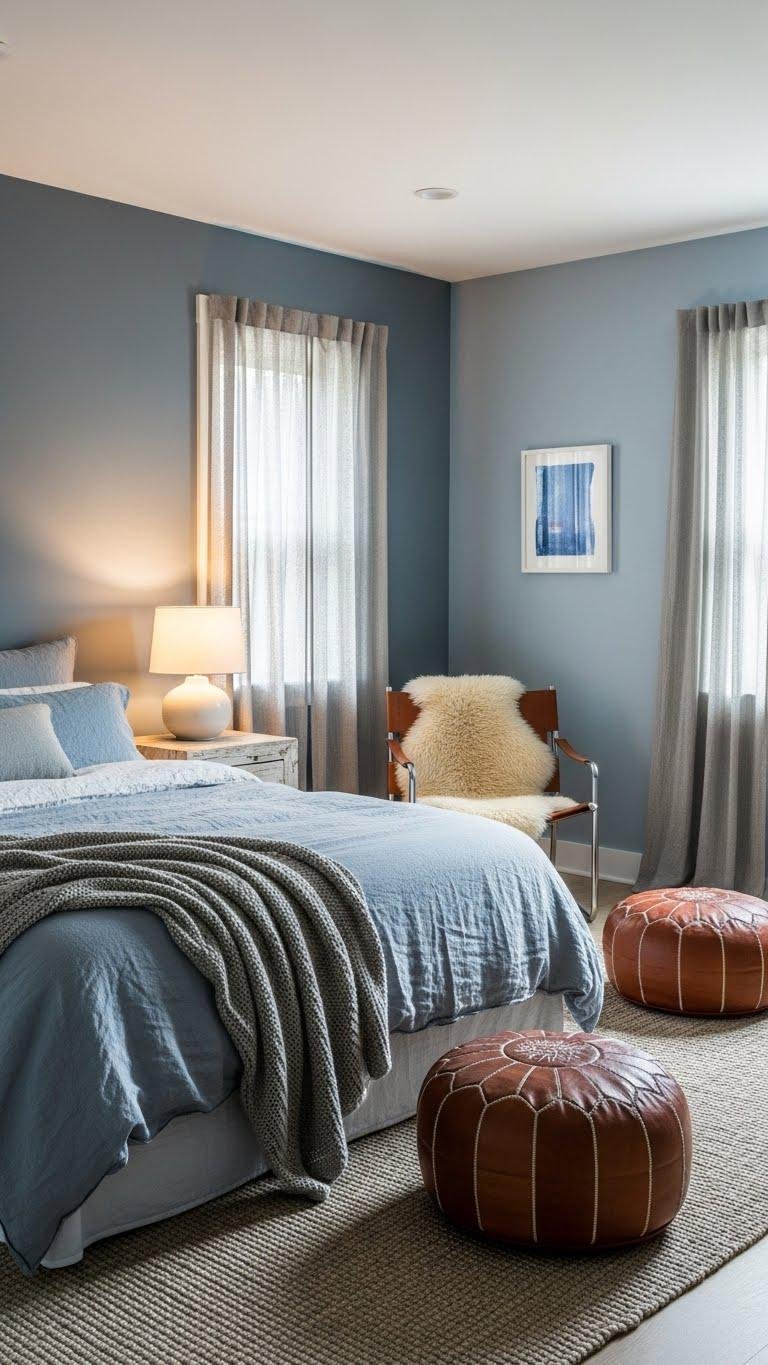 Choosing soft desaturated blues calms the room and nudges your body toward sleep: think slate, powder, and misty denim that read more like breathable fabric than bold color.