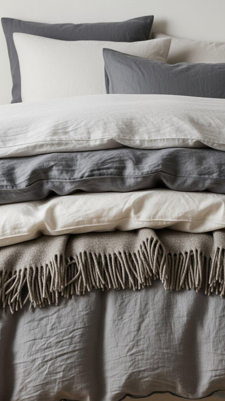 Start with breathable, natural fabrics—linen sheets, a cotton duvet, and a wool or cotton blanket—and arrange them so each texture shows.