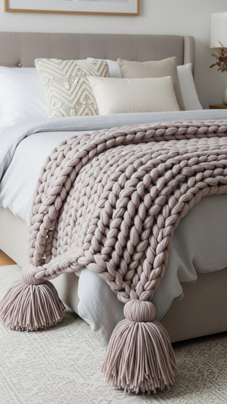 Drape a chunky knit throw across the foot of the bed to add instant visual weight and cozy warmth; its oversized stitches read from across the room, breaking up smoother surfaces and inviting touch.