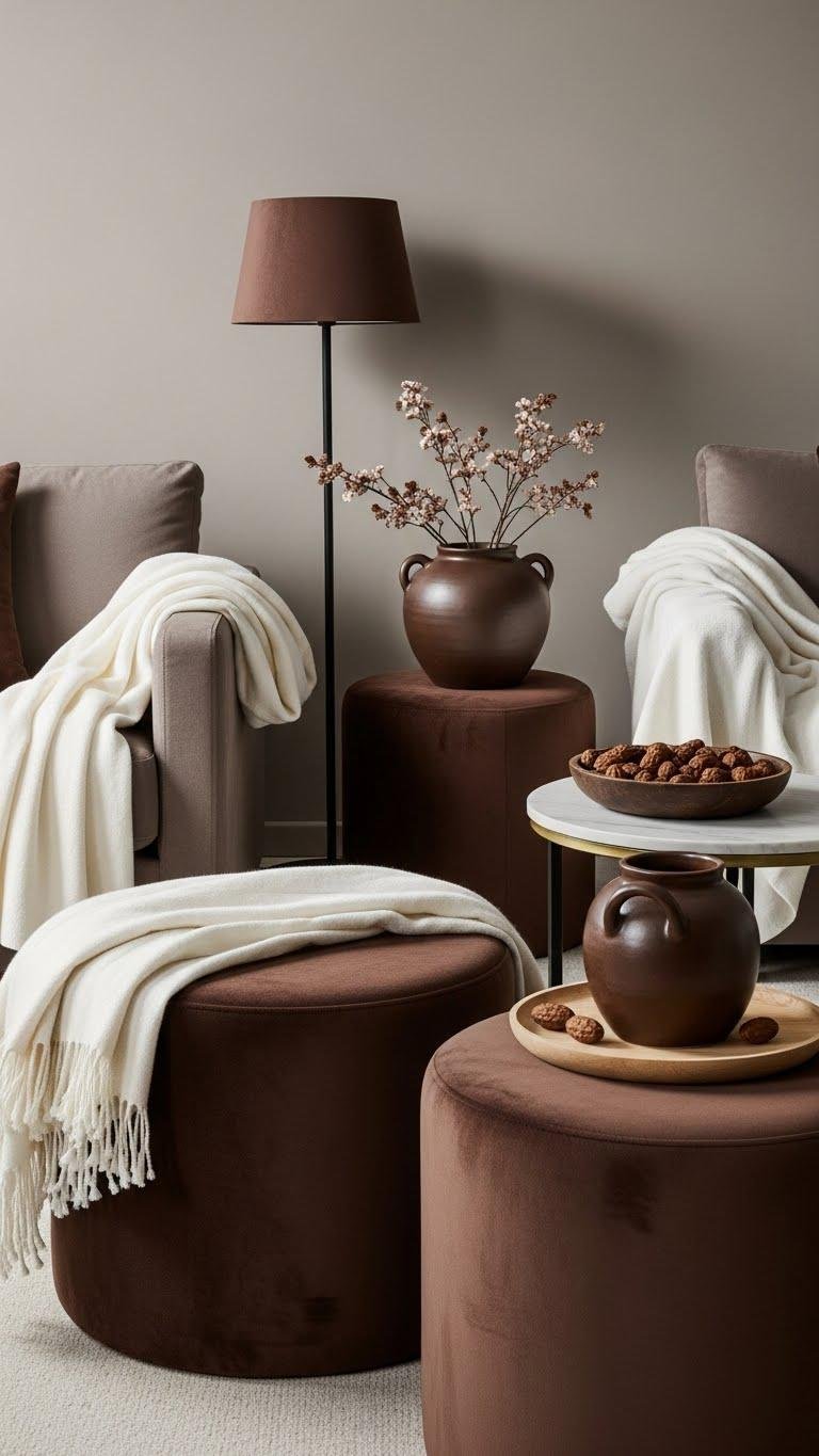 When you bring chocolate brown accents into a neutral room, they anchor the palette and add instant warmth without overpowering the space. You’ll pair velvet ottomans with crisp linen throws, choose cocoa ceramics for subtle shine, and balance depth with light textures.