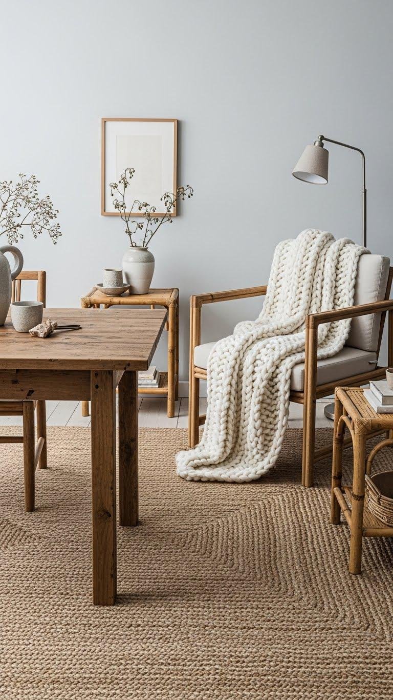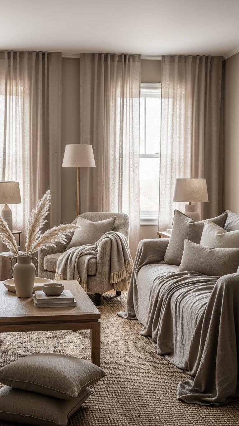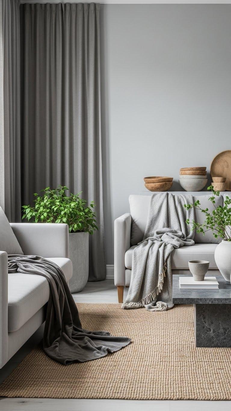 Layer soft greys over your palette and let natural textures do the heavy lifting: think linen drapes, wool throws, jute rugs, and matte stone accents that add depth without stealing warmth.