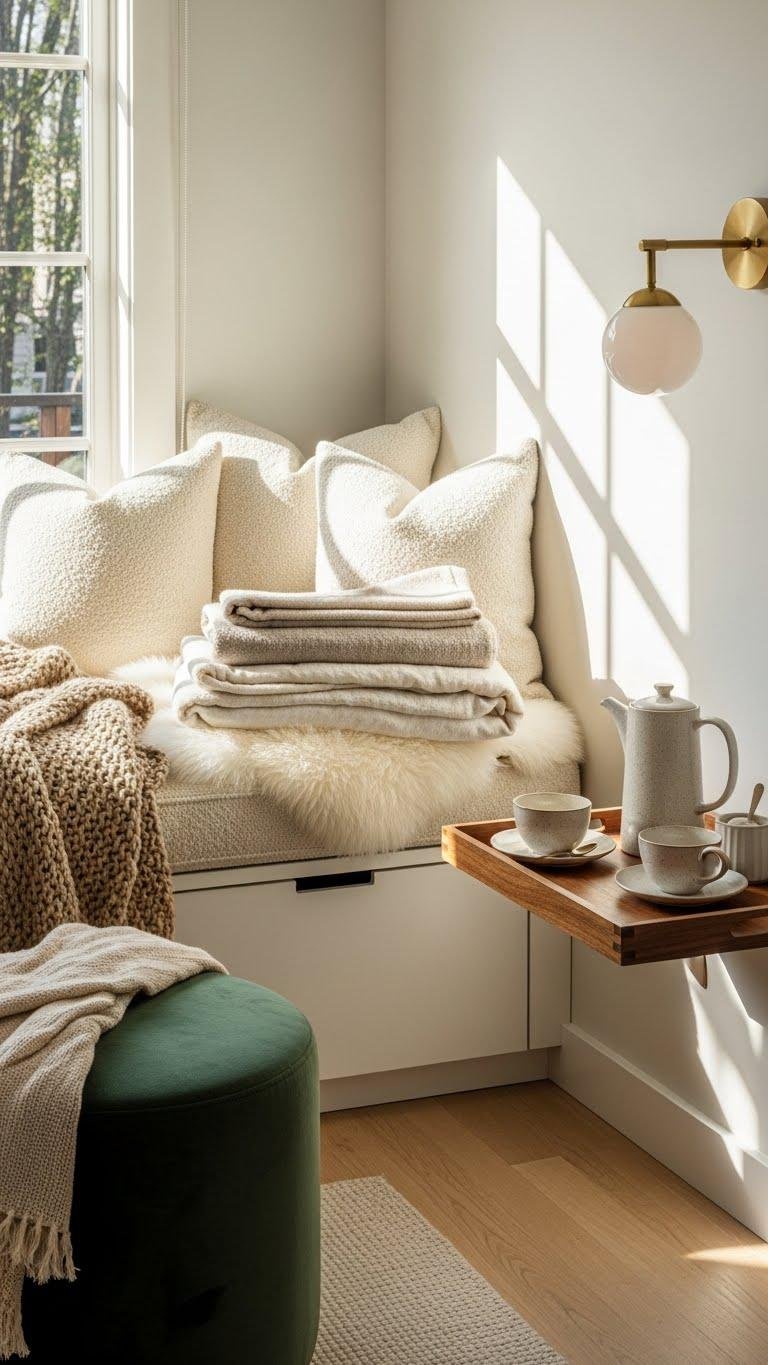 Now that you’ve established textural interest with bouclé cushions and velvet ottomans, bring that same tactile focus into a cozy reading nook. You’ll design a soft reading corner with a sunlit window seat, layered throws, and a compact tea station nearby.