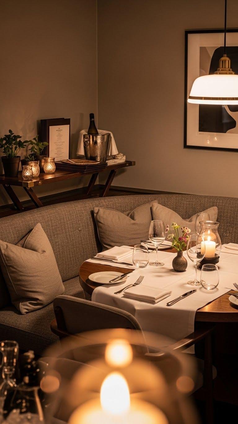 Want to make meals feel more personal and deliberate? Carve small zones with candlelit banquettes or cozy booth seating; choose neutral linens, sculpted cushions, and low pendant lighting to keep focus intimate. Float a round table to encourage conversation.
