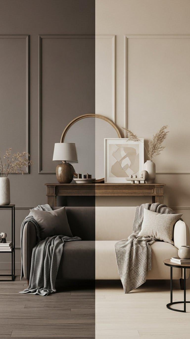 When you work with two-tone neutrals, aim for a clear anchor and a complementary partner so the room reads intentional rather than washed out; choose one deeper neutral to ground the space—think warm taupe, charcoal, or olive-gray—and pair it with a lighter, softer tone like cream, dove, or sandy beige to lift and breathe.
