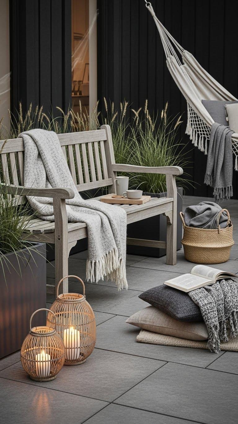 You’ll add scented lanterns for warm scent and light, a hammock nook for solo reading, and layered textiles to make the space feel free, functional, and restful.