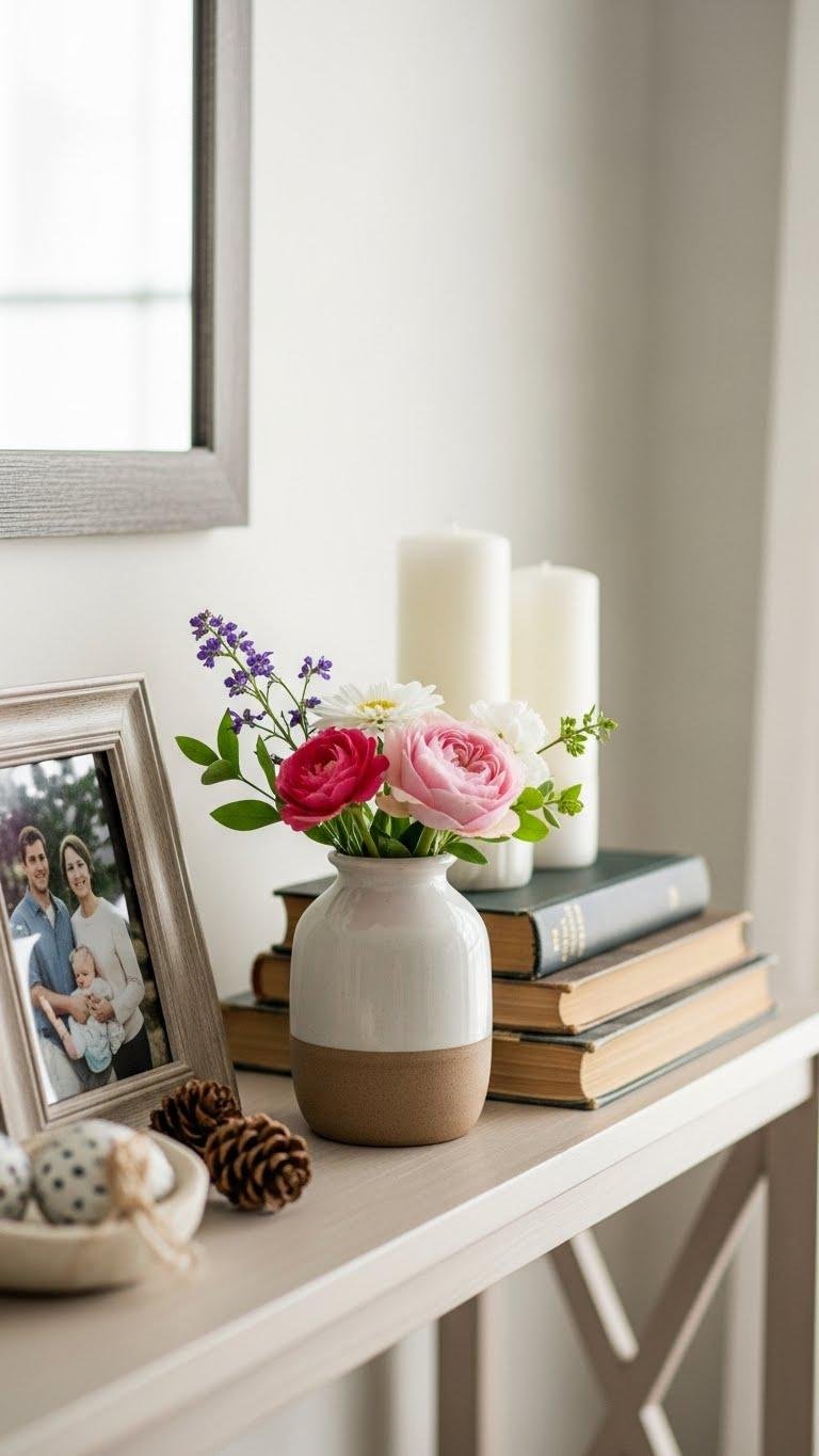 Set aside a single surface—a shelf, console, or corner table—and edit thoughtfully so each object earns its place; you’ll want a mix of heights, textures, and personal items (a small ceramic vase, a framed photo, a stack of worn books) arranged with negative space to keep the vignette calm and intentional.