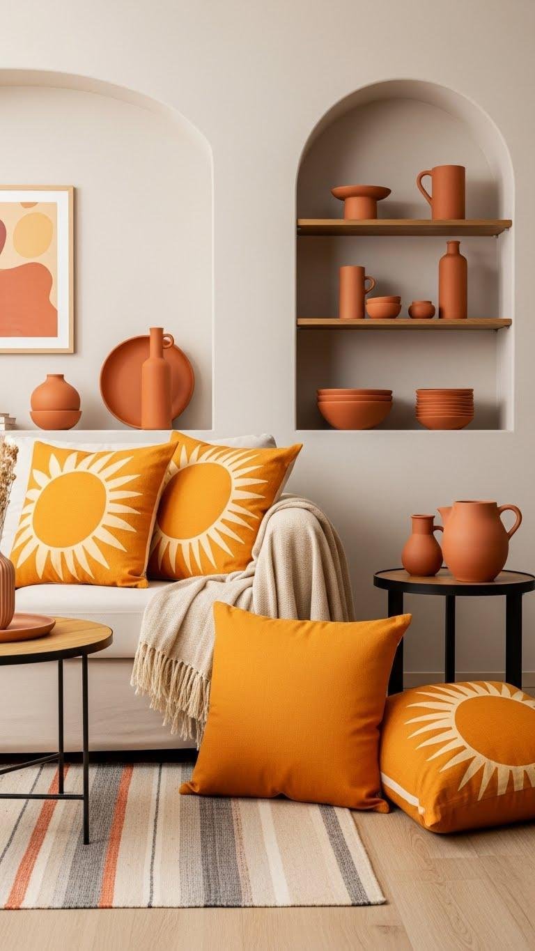 Depth brings personality: add ochre and terracotta touches to warm your beige base without overwhelming it. You’ll layer sunlit ochre throw pillows, a muted rug stripe, and terracotta ceramics on open shelving to create measured contrast.