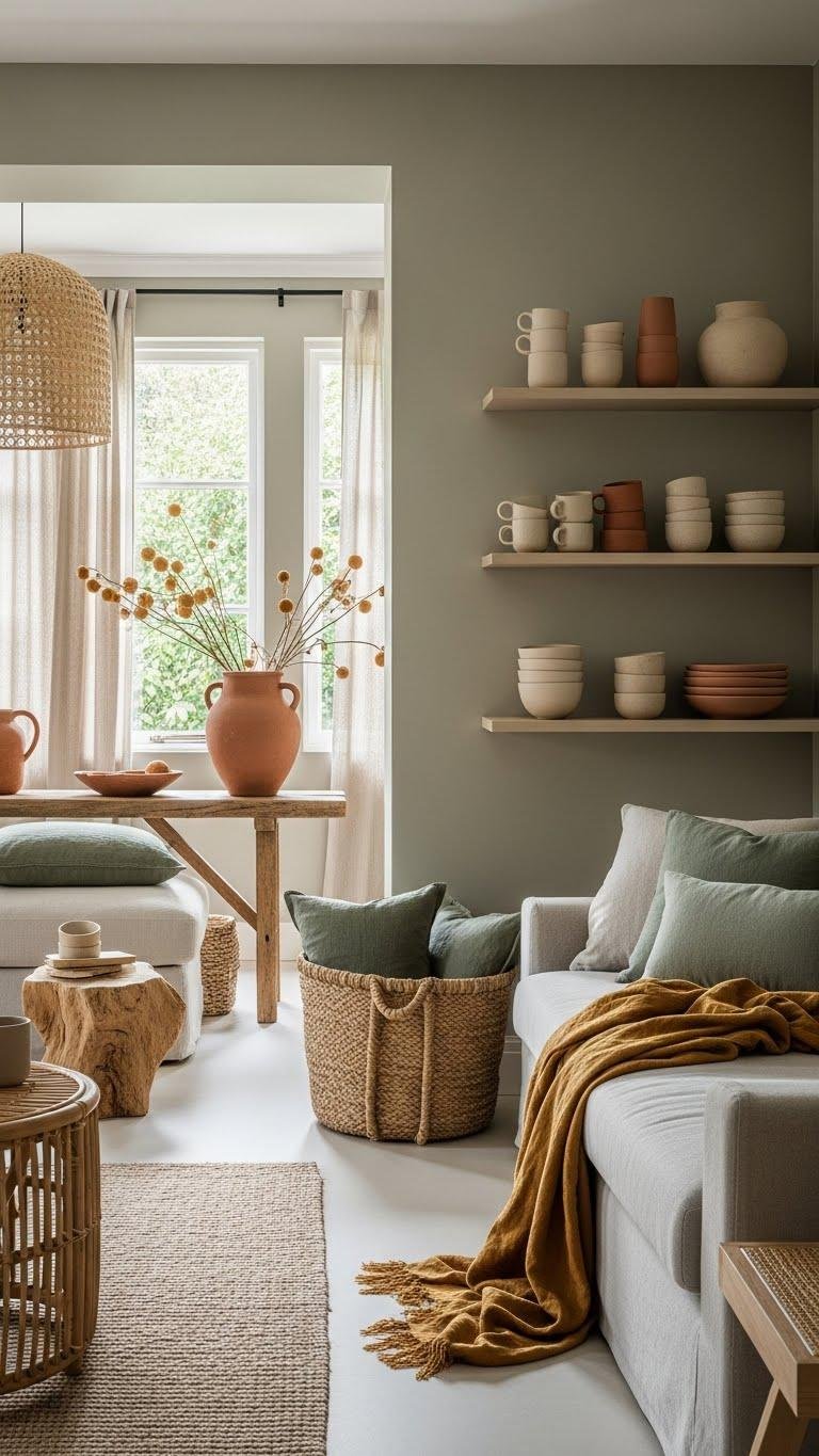 After you’ve warmed a beige base with ochre and terracotta, muted greens bring a softer, biophilic calm that balances those sunlit accents.