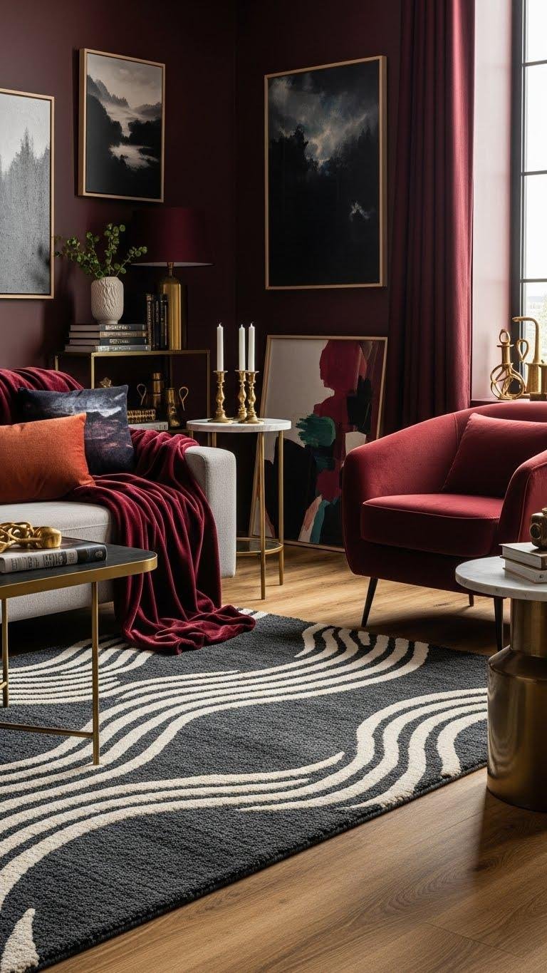 Bring in deep burgundy or oxblood to anchor a neutral palette with confident warmth and a hint of drama. Layer a velvet throw, sculptural rug, or accent chair to ground the room without feeling heavy.