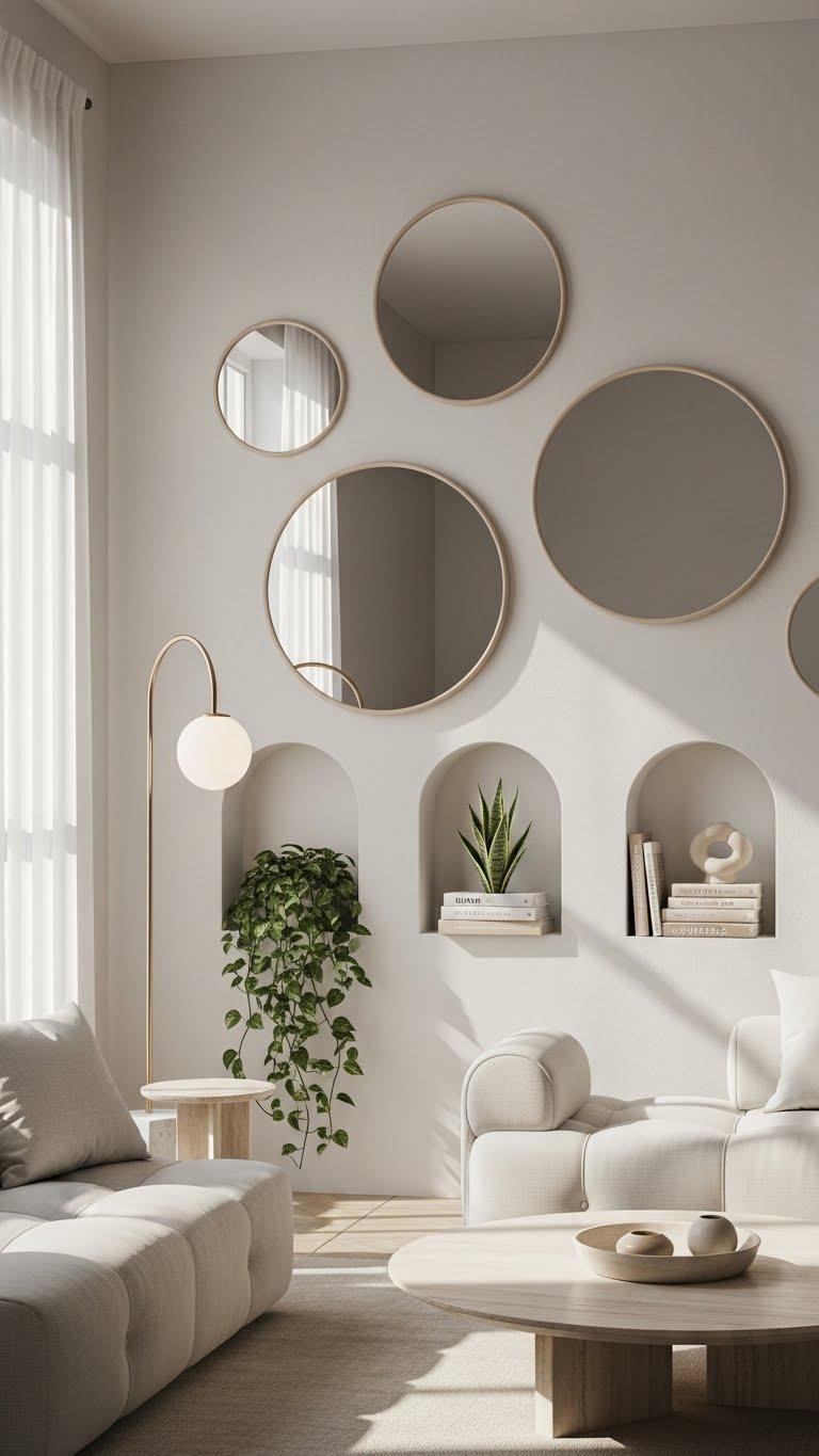 Why not soften harsh lines with rounded mirrors and arched details that echo your curved furniture? You’ll amplify light and create flow by hanging rounded mirrors at varying heights and carving subtle arched niches for plants or books.
