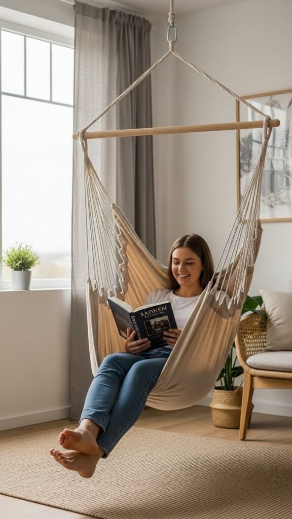 If you love the relaxed, horizontal comfort of a mattress nook, a hammock or swing chair gives you that same cradle-like ease while freeing up floor space and adding gentle motion.