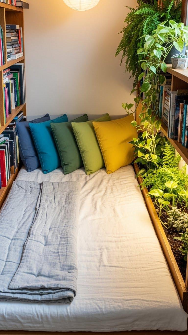 Arranged between low bookshelves, a soft mattress transforms a wall of books into an inviting lounge where you can stretch out and read without fuss. You’ll layer breathable linen, a thin quilt, and cushions for comfort, add ambient lighting for evening calm, and place an indoor garden nearby for fresh air.