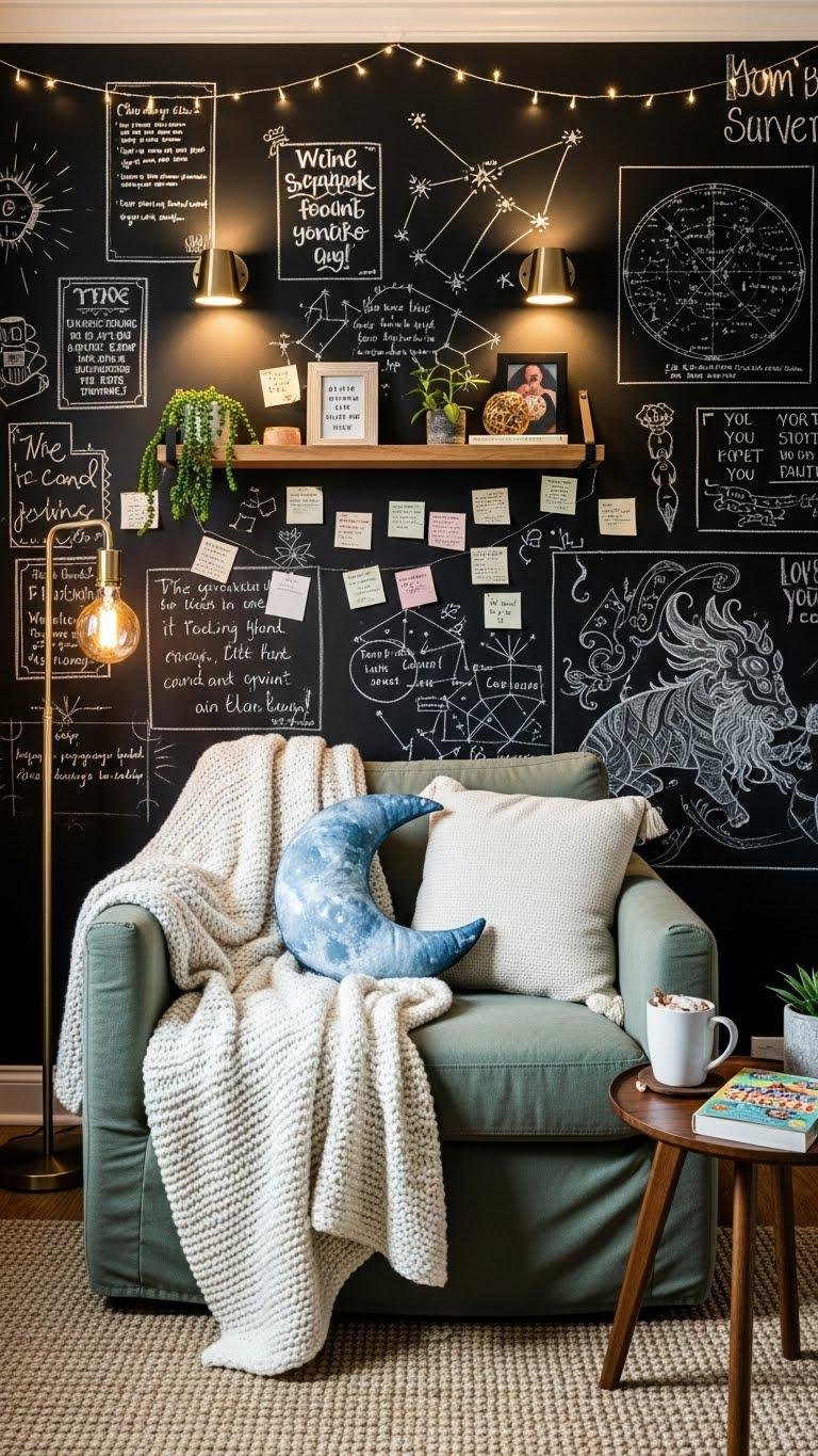 Add fairy lights for whimsy and a chalkboard wall for notes, quotes, and evolving art. It’s freedom-friendly, low-clutter, and easy to personalize.