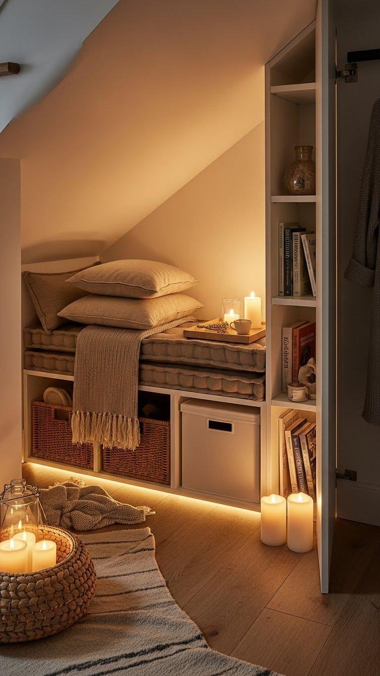 You’ll fit a slim bench, layered cushions, and storage that frees your floor. Add a hidden bookshelf for secrecy, soft textiles, and candle safe lighting or low-watt LEDs. This compact hideaway lets you read, breathe, and choose solitude.