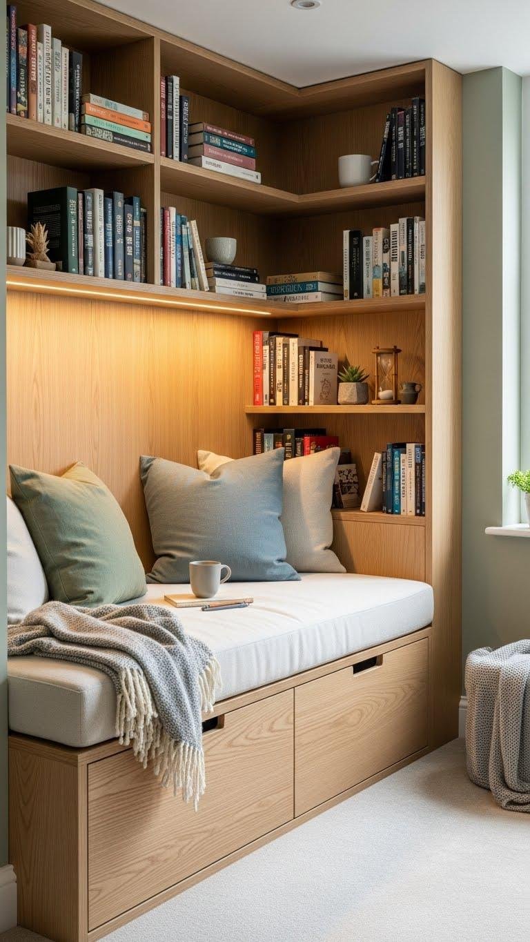 You’ll carve a sunlit niche for books, add discreet cozy storage for extras, and install adjustable reading lighting to control mood.