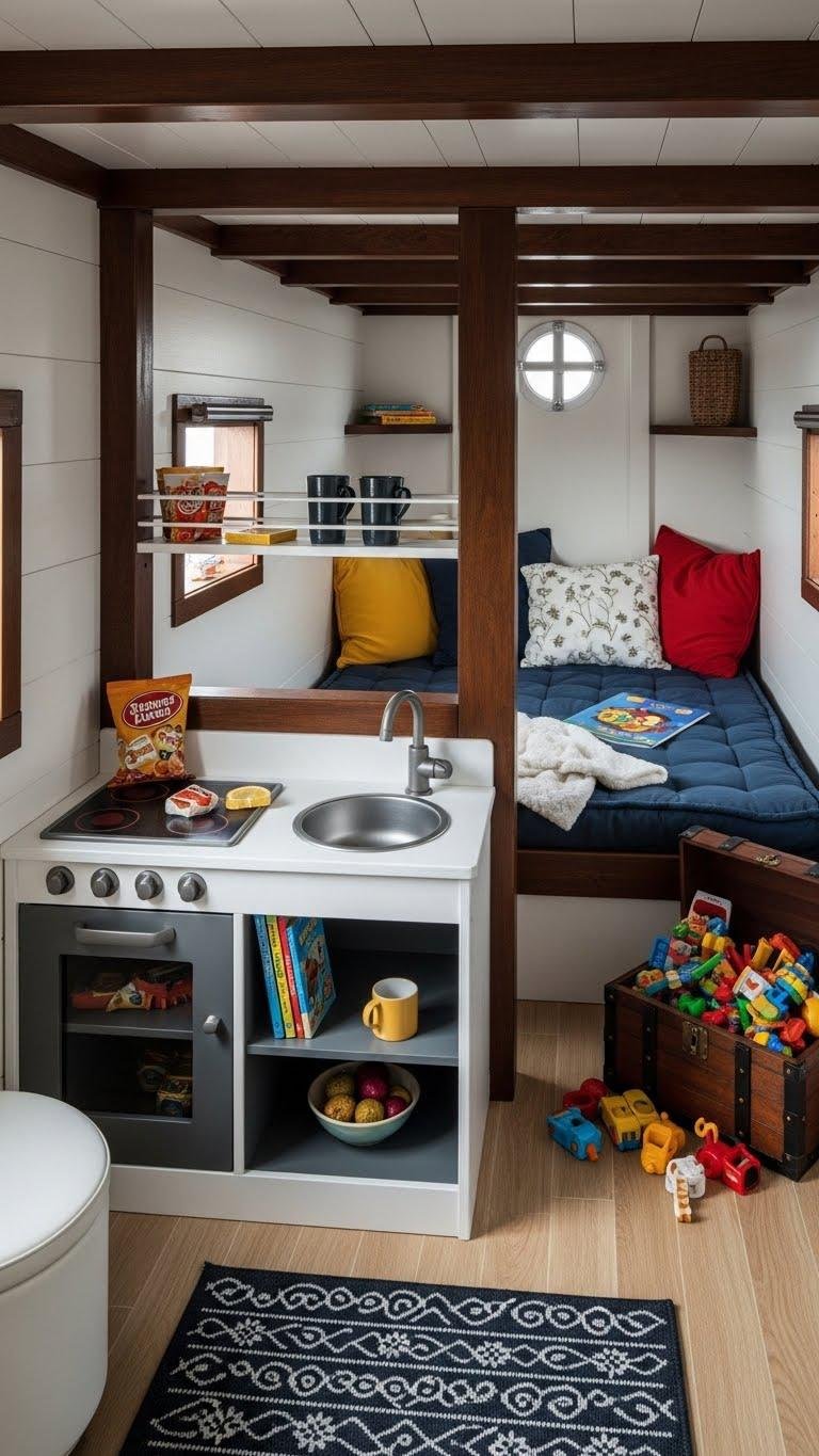 You’ll build a compact mini galley for snacks and books, a cozy berth with cushions, and a tucked-in treasure chest for toys. Keep lines simple, materials durable, and colors freeing to inspire independent exploration.