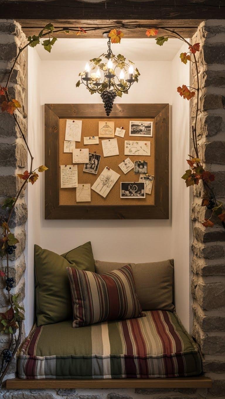 You’ll choose a custom cushion that fits the alcove, rustic fabrics and muted hues, a vintage corkboard for notes, and a small grapevine chandelier to set mood.