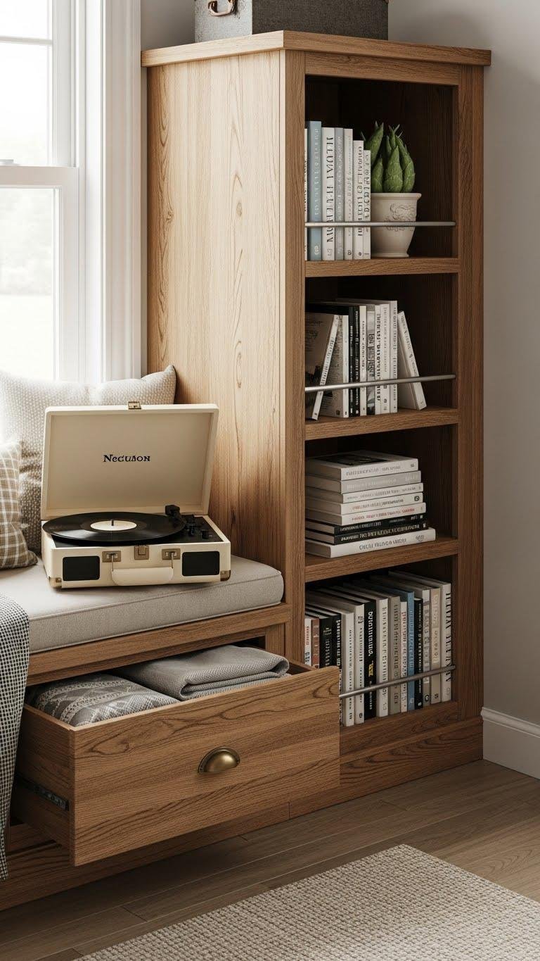 Slip into a Nashville-style window seat that blends warm, lived-in wood tones with clever side shelving so you can keep your favorite reads and a record player within arm’s reach.