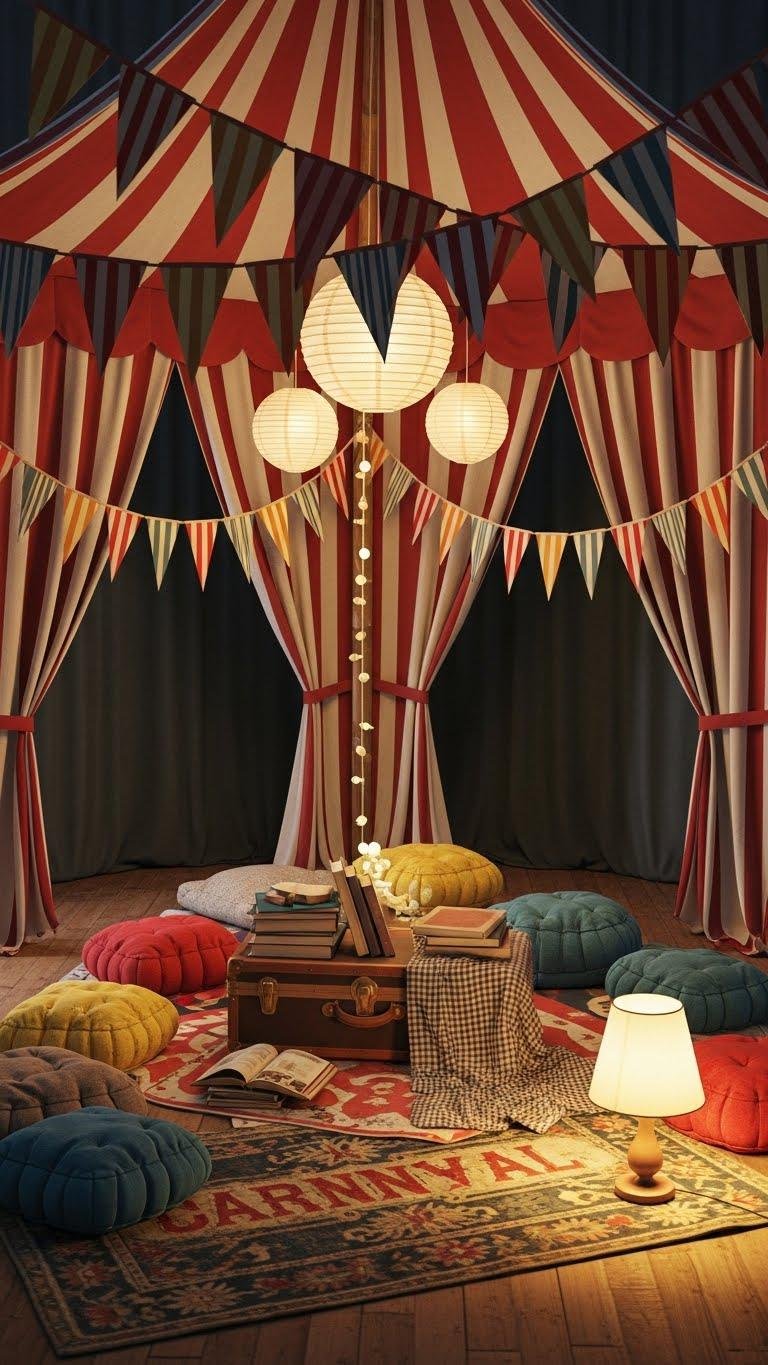 Step into a circus-tent nook that turns reading into a playful escape, where striped fabric panels and soft, diffused light create an intimate canopy just for you.