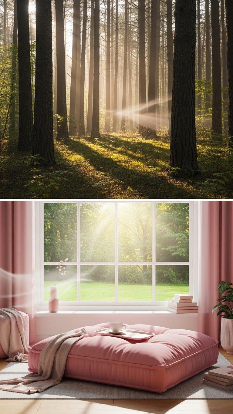From the hush of the forest glade, shift toward sunlight pooling on a wide sill where an oversized pink cushion invites you to curl up beneath a large window.