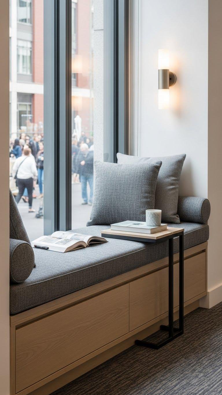 Tucked into busy corridors or overlooking the street, a deep window seat turns high-traffic areas into calm, usable space that invites quick rests, reading, or people-watching.