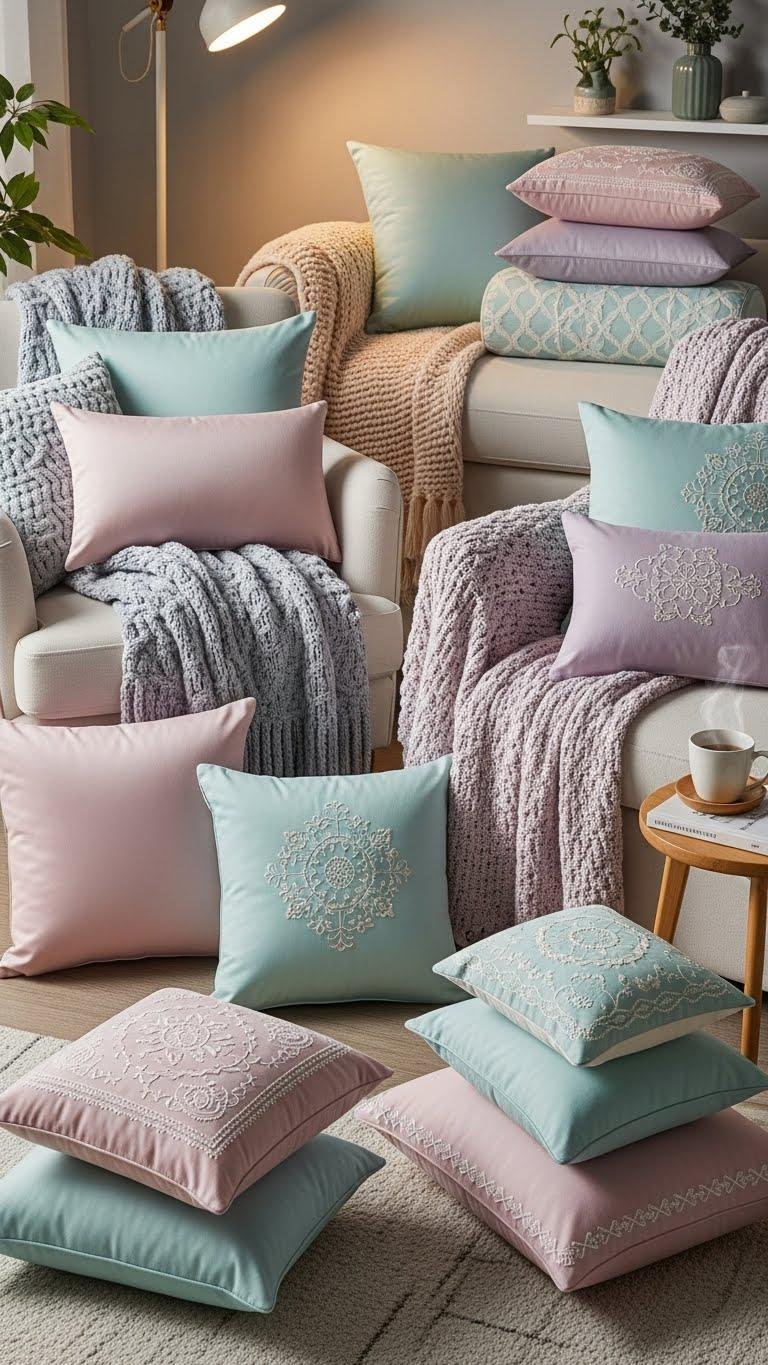 A few well-chosen pastel pillows can instantly soften seating and lift a room’s mood; choose muted pinks, mint, and lavender to create a cohesive, calming palette. You’ll mix silk cushions with textured throws and embroidered bolsters for contrast, arranging them in odd numbers for effortless balance.