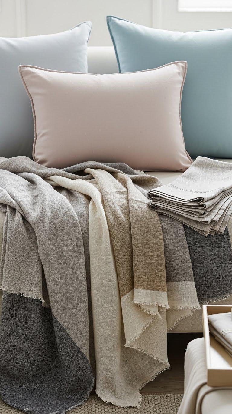 Pair those soft pastel pillows with lightweight linen throws to keep the look airy and lived-in. You’ll layer gauze throws for texture and drape, mixing neutral tones with a single muted accent.