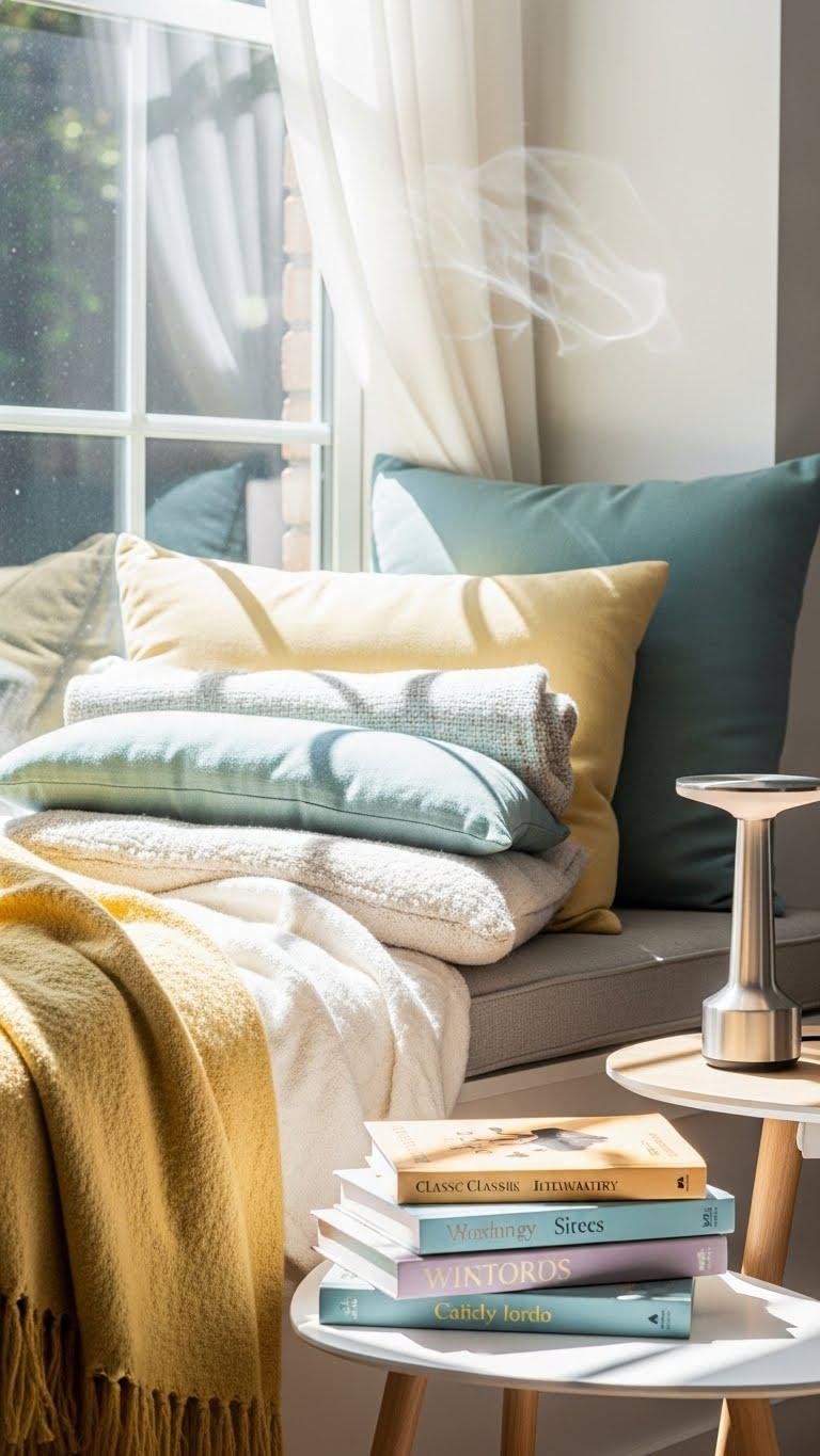 Beneath a sunlit window, carve out a compact reading nook that feels deliberately snug. Claim a sunlit alcove with a cushioned window seat, layered throws, and a tidy bookstack display.