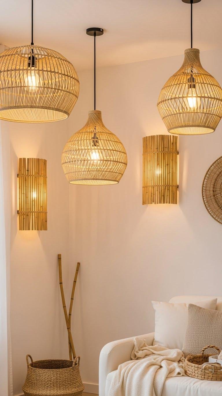 Choose rattan pendants over heavy glass to create airy warmth, and pair bamboo sconces for layered, flexible illumination.