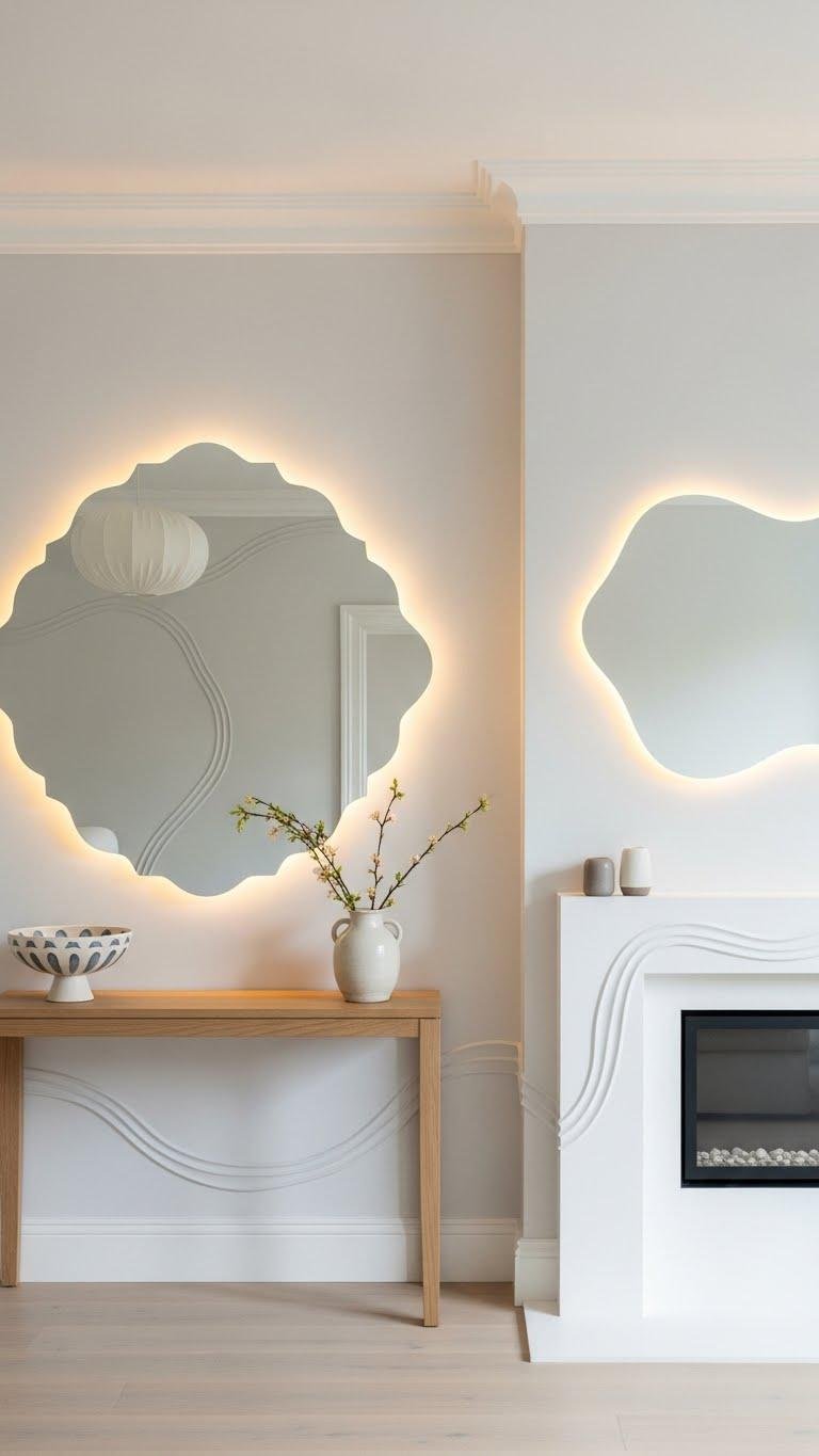 You’ll use scalloped mirror placement to soften hard lines—over a console, mantel, or entry—while wavy mirror reflections scatter light and mood. Choose simple frames, keep surrounding decor minimal, and let these shapes create movement, openness, and a liberated, effortless vibe throughout your space.