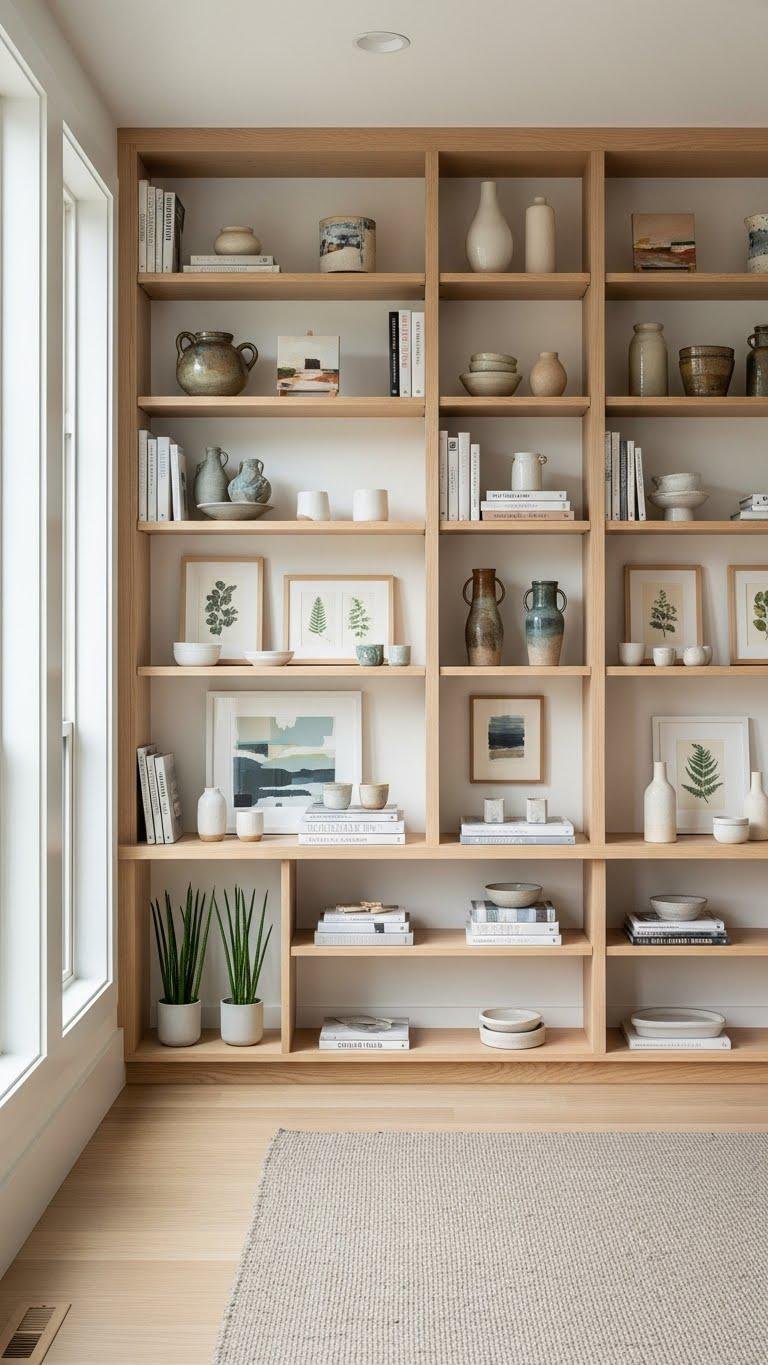 Open up your room with airy open shelving that feels curated, not cluttered. You’ll choose pieces sparingly, alternating art, ceramics, and books to maintain negative space.