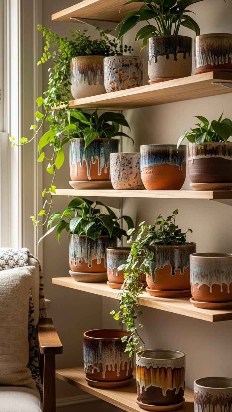 After you’ve curated airy shelves, bring warmth and tactile contrast with textured terracotta planters. Choose pieces with handmade glazes for subtle variation and honest imperfection that echo a liberated aesthetic. Position plants to enjoy light, and prioritize practical drainage solutions so roots stay healthy.