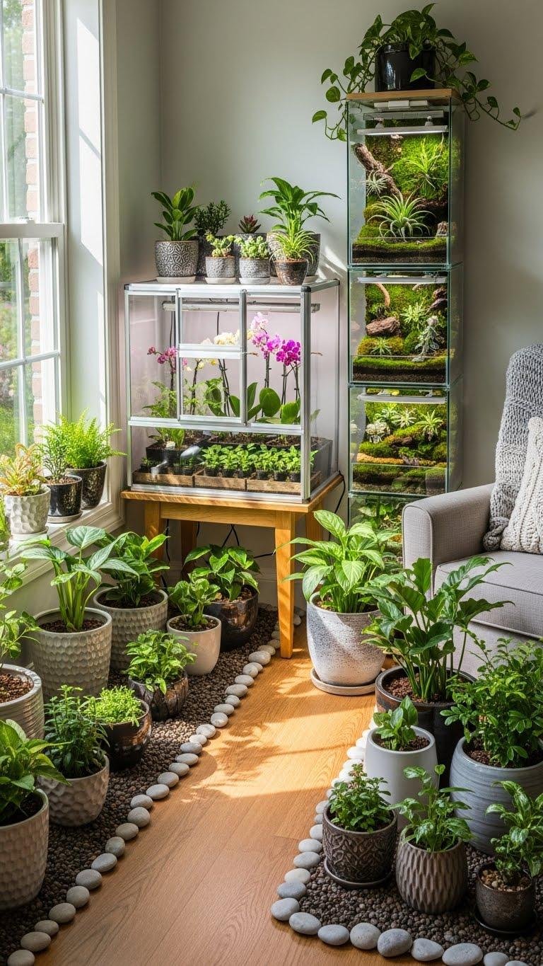 If you loved the impact of oversized botanical art, bring that same bold energy down to ground level by carving out a mini indoor garden corner. You’ll pick a sunlit niche, mix textured pots, and add a compact mini greenhouse or vertical terrarium to maximize growth.