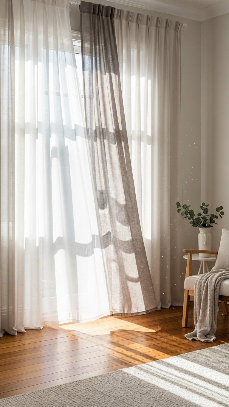 Let soft, sheer curtains filter light into the room to instantly lift the mood and soften hard lines; choose fabrics that breathe—linen blends, lightweight cottons, or semi-transparent voile—to keep the look airy without sacrificing privacy.