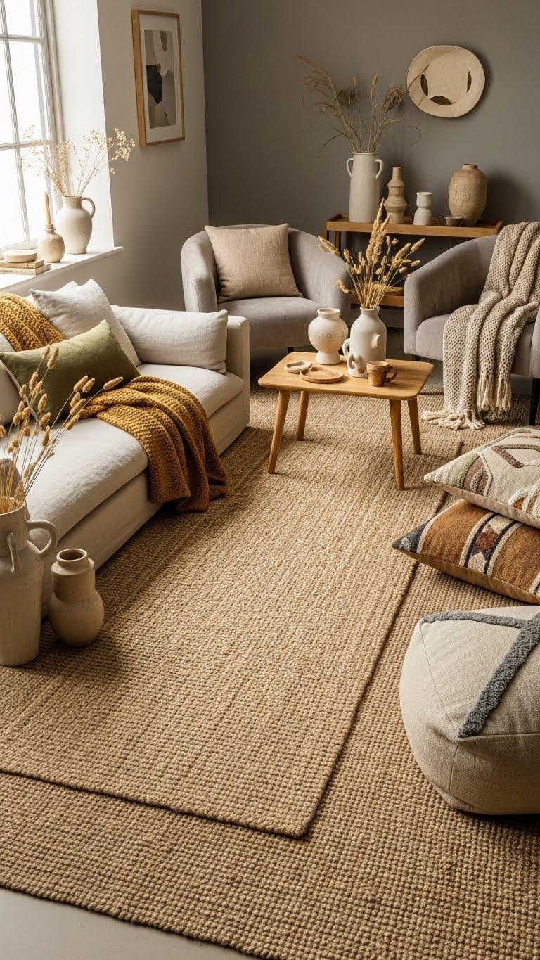 Embrace jute layering for its relaxed, durable feel, then place a sisal textures runner or rug to introduce subtle pattern and grip. Mix pile heights, anchor furniture, and keep palettes muted so spaces feel open, calm, and free.
