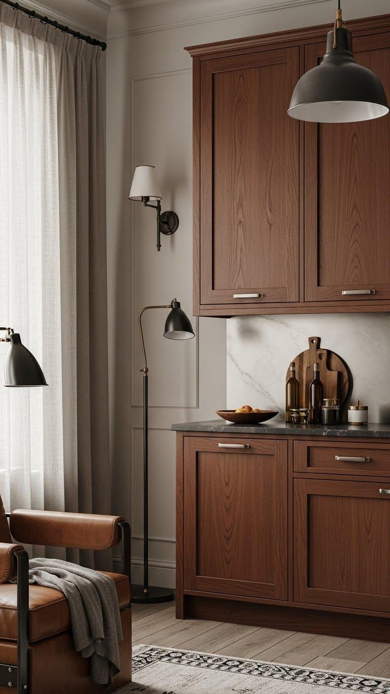 You’ll create a liberated, refined vibe by pairing rich cabinetry with antique leather accents and moody lighting.
