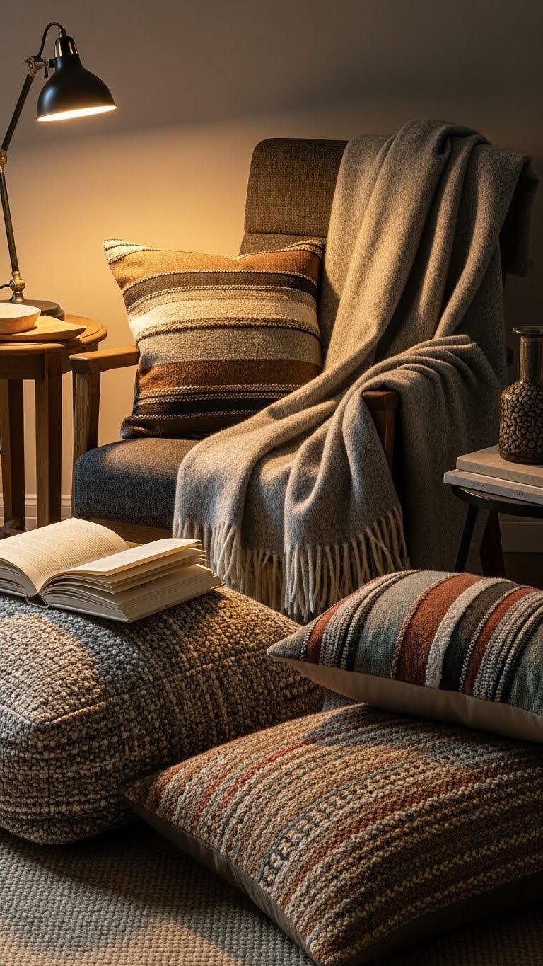 Choose hand knit throws for artisanal character, muted earth tones, and durable weaves. In a reading alcove, add a low lamp and a small side table to complete your freeing, cozy retreat.