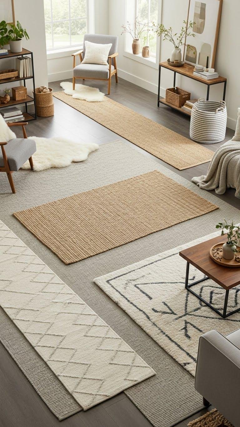 Layering rugs lets you define zones while keeping an open, cohesive feel — place a smaller, textured rug over a larger neutral base to anchor seating or reading areas without breaking the room’s flow.