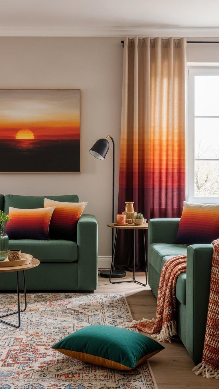 Now that you’ve chosen recycled textiles and rugs to set a sustainable baseline, apply the 60-30-10 rule to shape a balanced, inviting earth-tone palette. Use 60% neutral soil inspired palettes for walls and large furniture, 30% richer tones for upholstery and curtains, and 10% bold accents in sunset gradients. You’ll create calm structure while keeping adventurous, free-spirited pops.