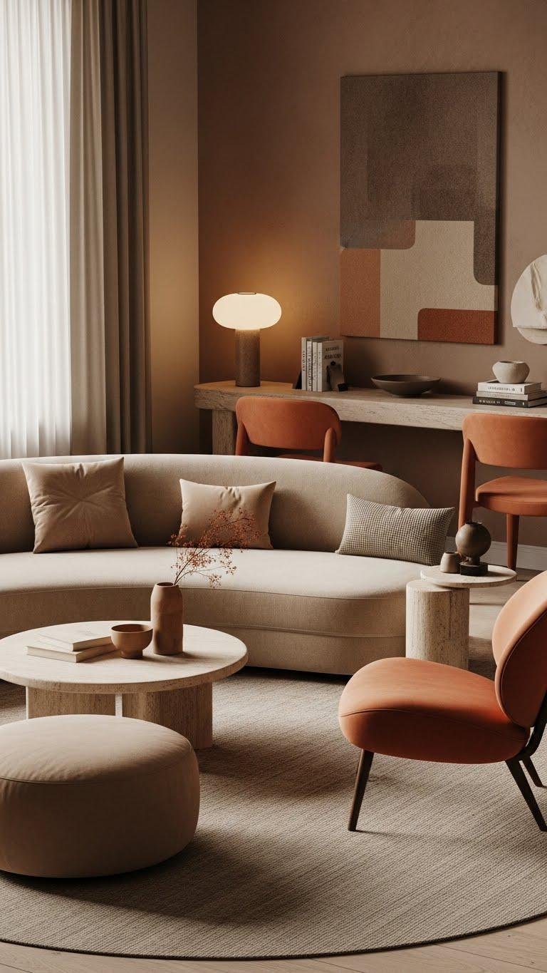 Bring in curved furniture to instantly soften hard angles and lend a relaxed, organic feel to your earth-toned room. Choose pieces with rounded silhouettes and organic curves—sofas, chairs, and ottomans—that invite movement and calm.