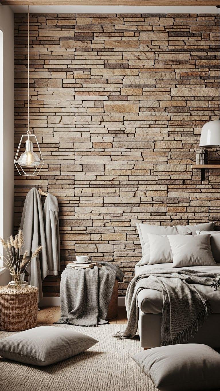 Choose a rustic veneer for easier installation, then layer neutral textiles and simple lighting so the wall breathes without overwhelming your serene, open space.