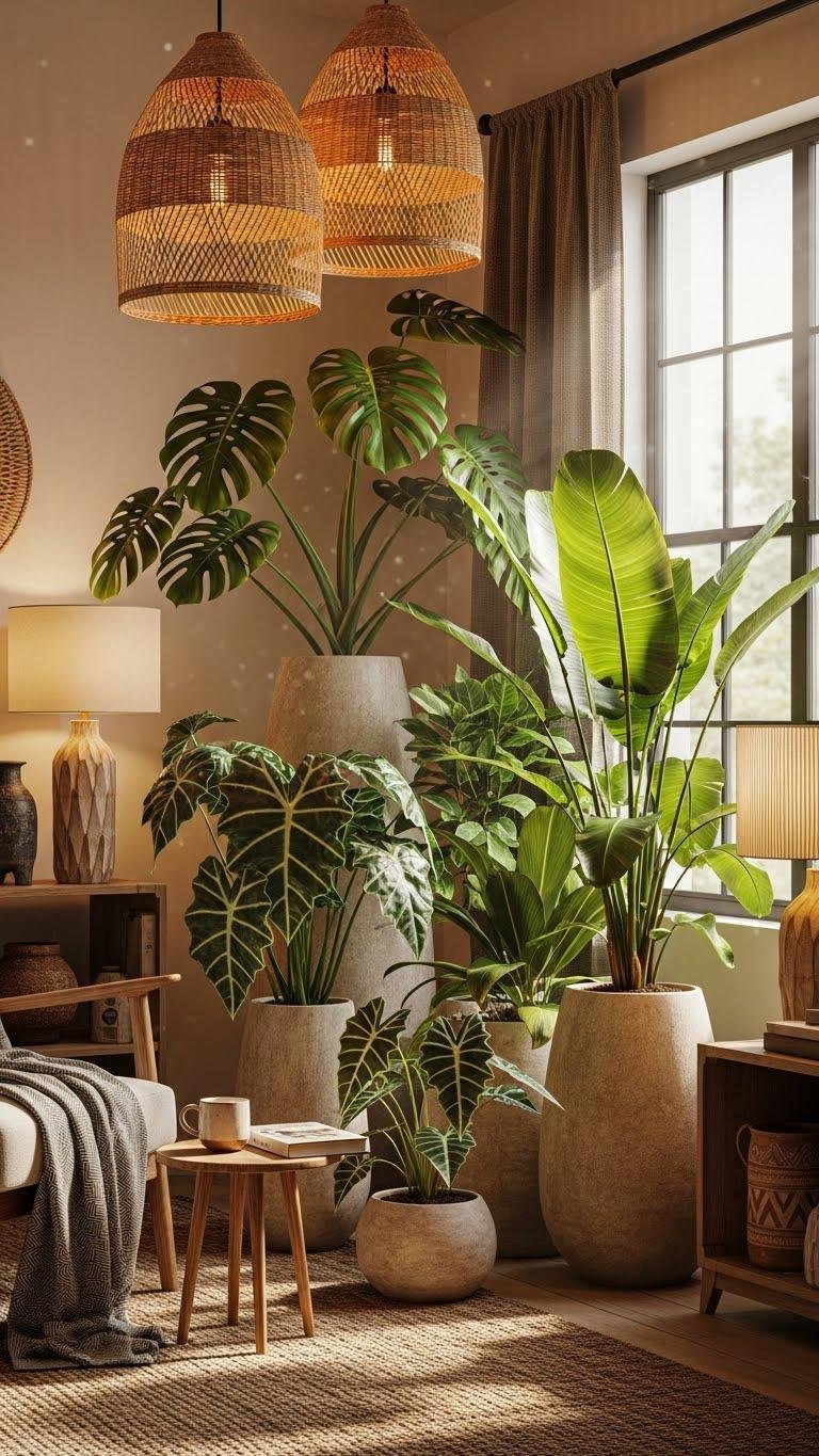 Woven lighting sets a warm, tactile tone, and large-leaf houseplants amplify that organic warmth by adding living scale and verdant texture. You’ll place tropical focalpoints—like monstera or bird-of-paradise—to anchor rooms, creating carefree, open vibes.