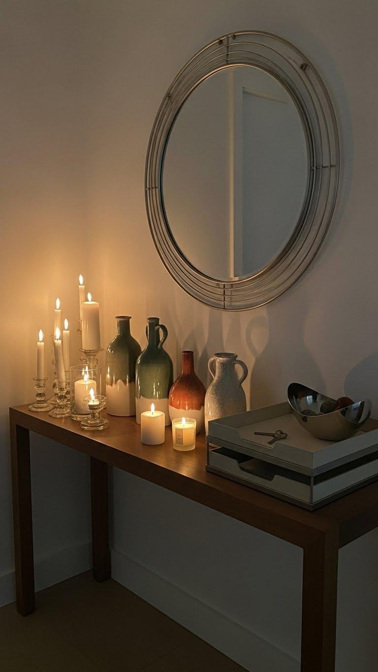 Anchor your entryway or hallway with a thoughtfully styled console that pairs candles and ceramic vessels to balance form and function. You’ll mix varying heights and textures to create calm, independent arrangements.