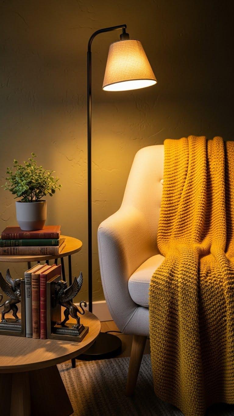 Creating a cozy reading nook starts with a few intentional choices: position a slim floor lamp to cast warm, focused light, arrange a small stack of your favorite books on a low side table or staggered shelf, and add a comfortable chair with a soft throw for texture.