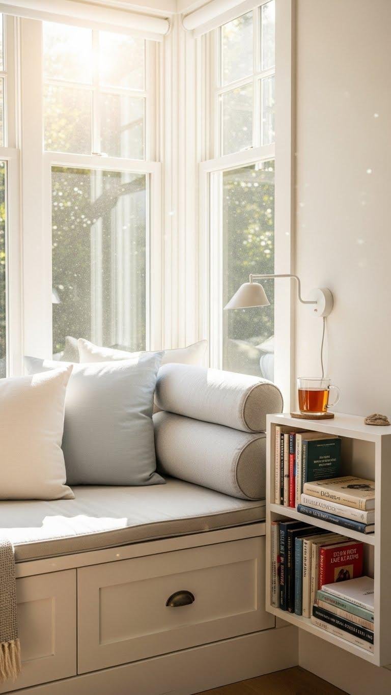 Why not carve out a sunny window seat that doubles as your favorite reading nook and a calm visual anchor? You’ll shape a bay bench or cozy window alcove with slim cushions, layered lumbar pillows, and built-in storage beneath.