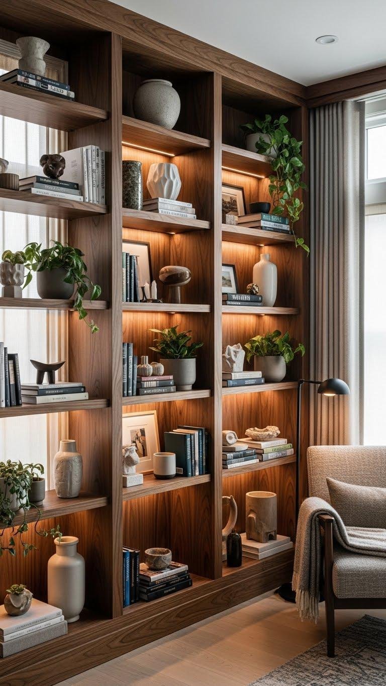 Install built-in walnut shelving to add warmth, storage, and architectural polish to a room while keeping the footprint clean and intentional. You’ll customize walnut cabinetry to suit books, plants, and curated objects, preserving negative space for breathing room.