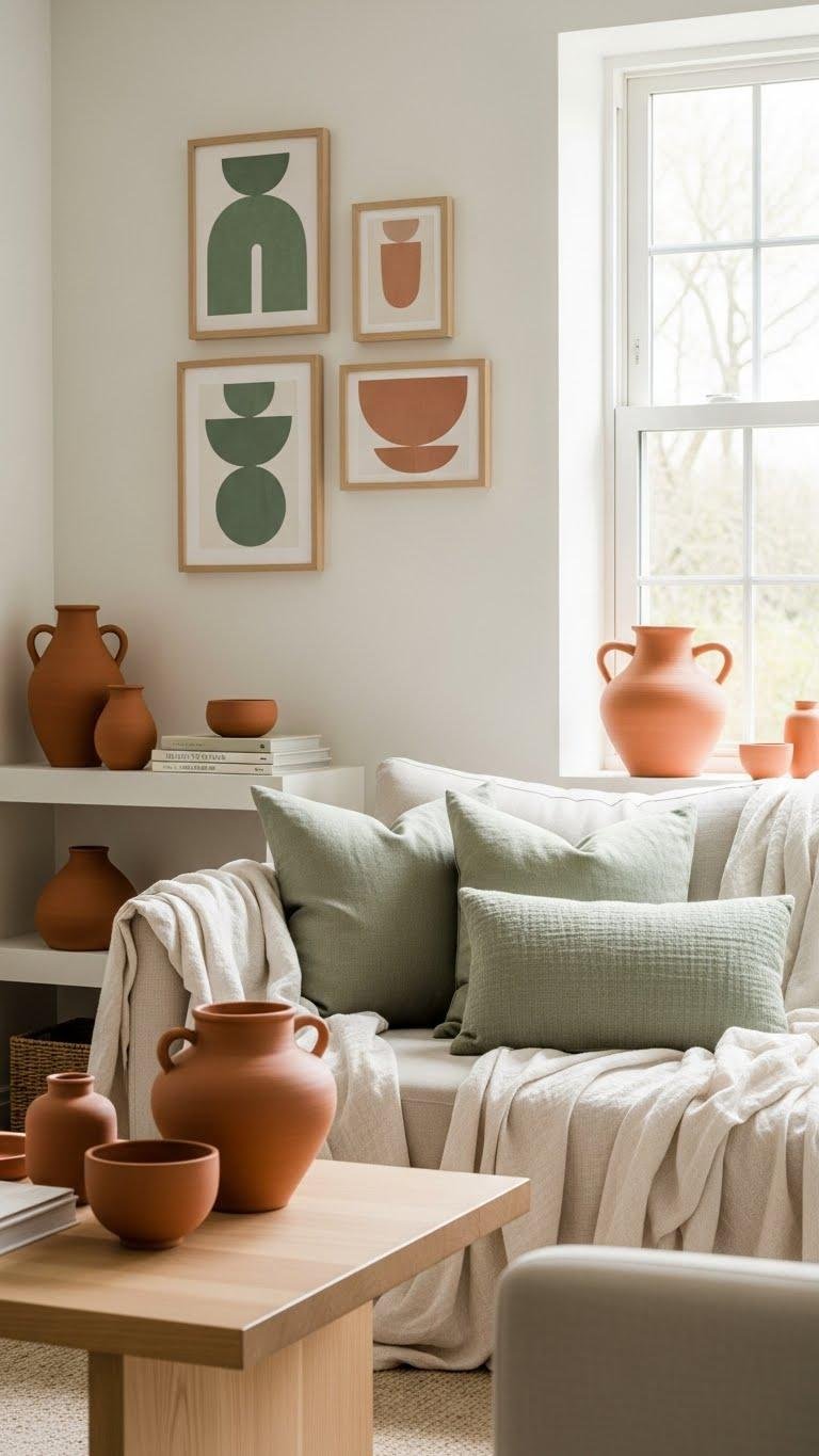 Choose muted terracotta and sage accents to introduce warmth and calm without overpowering a room. You’ll layer subtle terracotta ceramics, linen throws, and sage accents in artwork or pillows to craft an effortless, grounded palette.