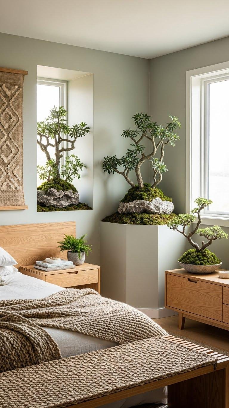 You’ll balance woven throws, a natural fiber wall accent, and simple timber furniture. Add indoor rockeries for low-maintenance sculptural greenery, maximize light, and keep surfaces clear so you can move freely and wake refreshed.