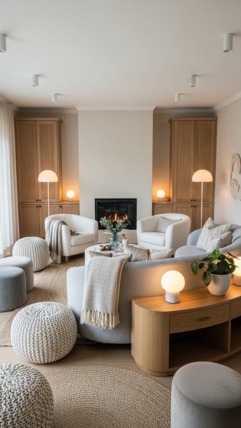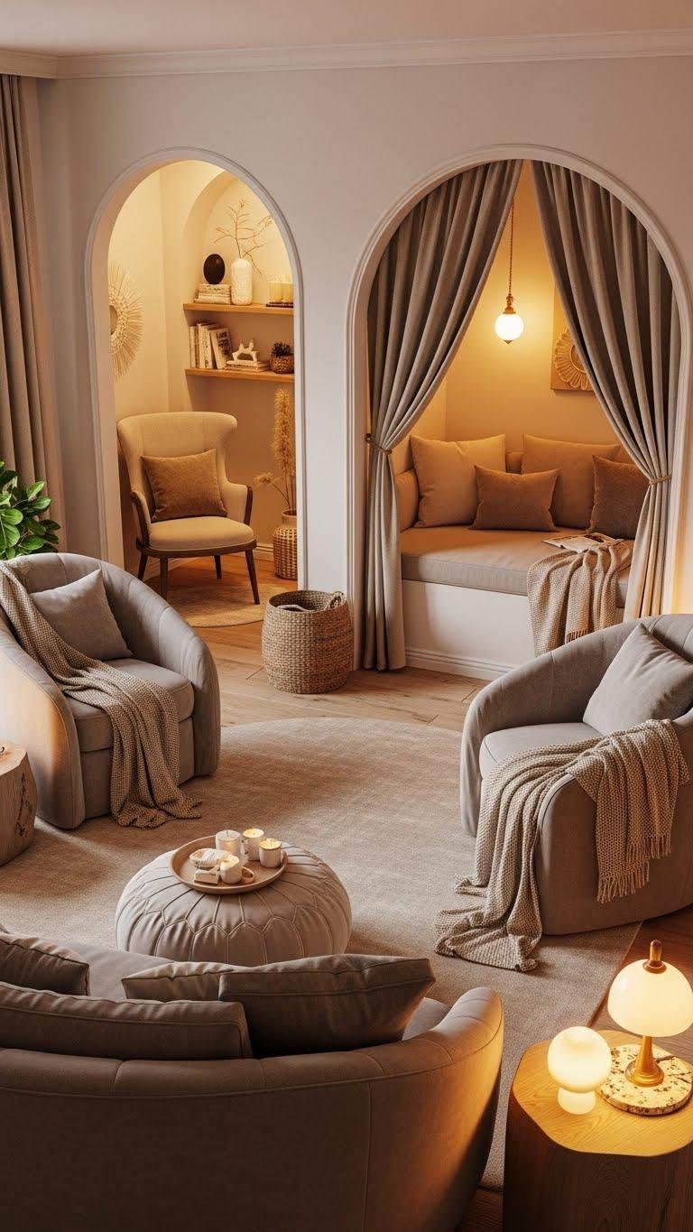 You’ll shape rounded nooks for reading or rest, layer cocoon fabrics on chairs and throws, and place soft lighting to hug each corner.